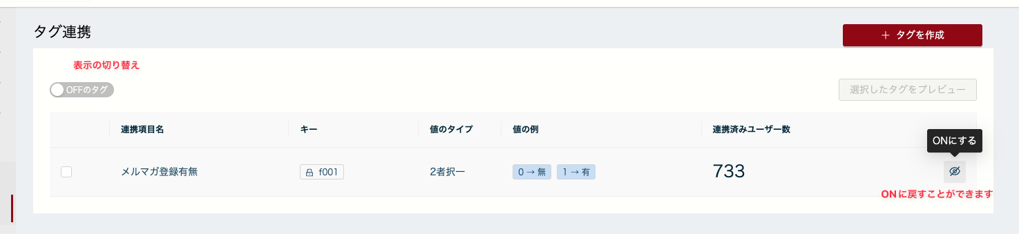 「OFF」にしたタグは左上のトグルを切り替えることで確認できます。