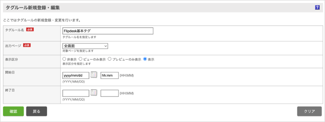項目名 説明 タグルール名 「Flipdesk基本タグ」など、分かりやすい任意の名称を記入 出力ページ 「全画面」を選択 表示区分 「表示」を選択 開始日 任意で設定日などを設定 終了日 設定しない -